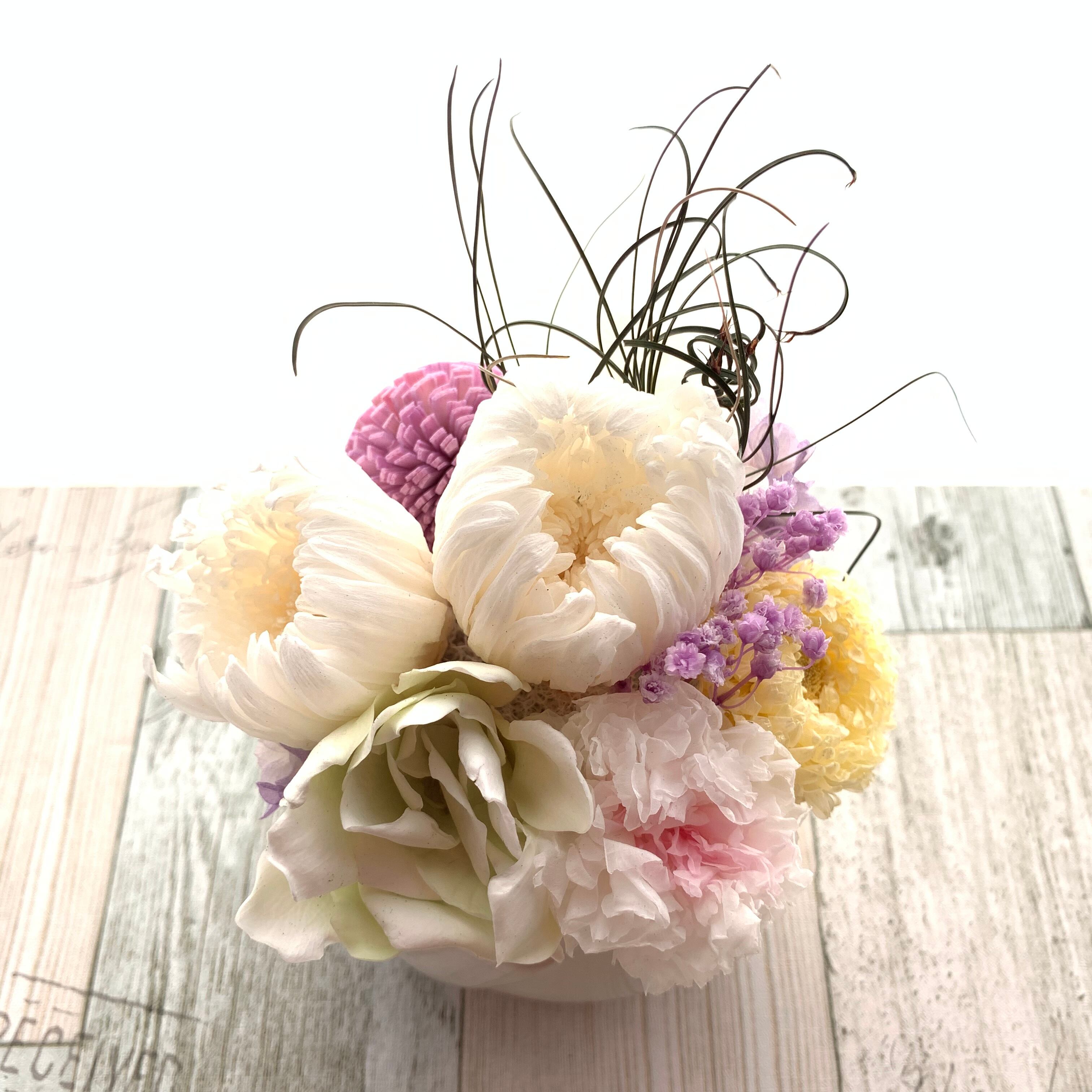 大切な方を偲んで、穏やかな優しい色合いのプリザーブドフラワーアレンジメント
