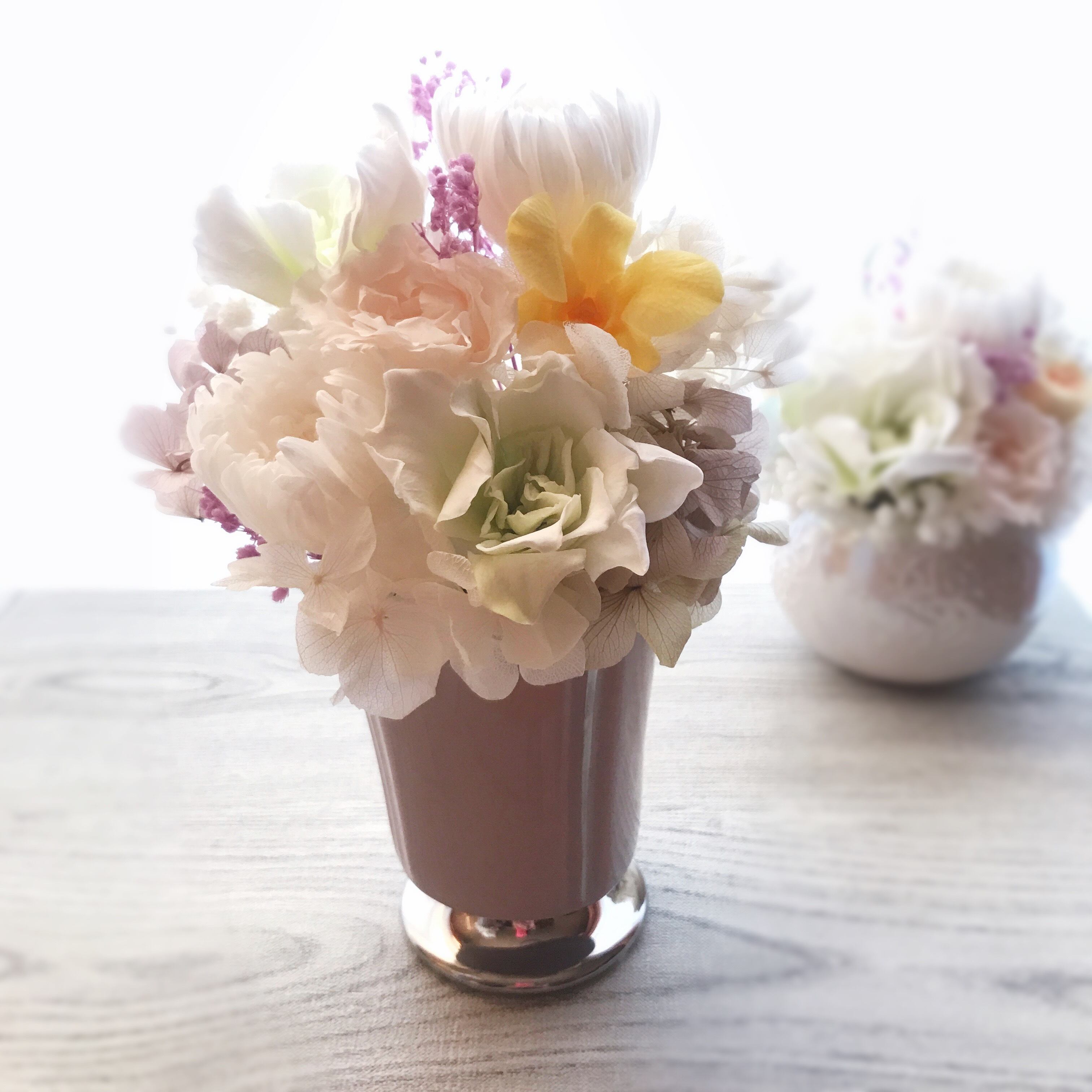 大切な方を偲んで、穏やかな優しい色合いのプリザーブドフラワーアレンジメント